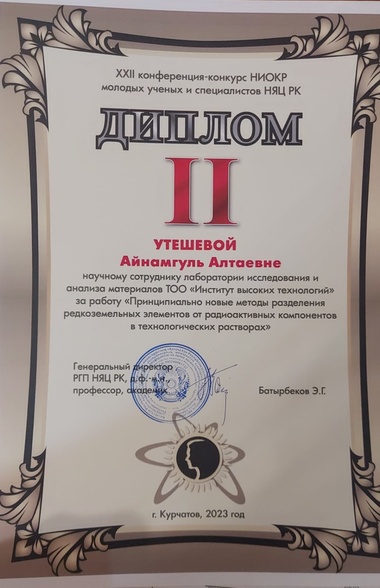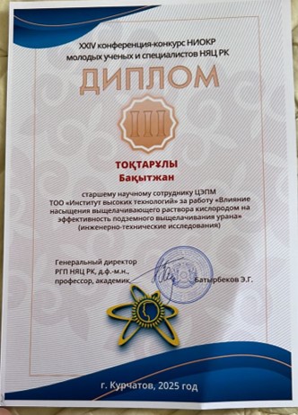 Диплом III степени за работу «Влияние насыщения выщелачивающего раствора кислородом на эффективность подземного выщелачивания урана» — свидетельство глубины Ваших исследований и высочайшего профессионализма.